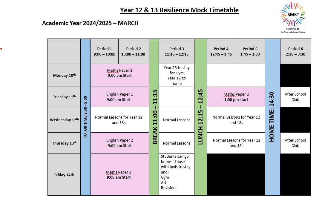 Monday March 10th-Friday March 14th the Post 16 Centre will be undergoing Resilience Mock Week - in line with new requirements from the governing exam board (JCQ) for us to have a teacher assessed mock should the formal summer exams not be able to be held for any reason.