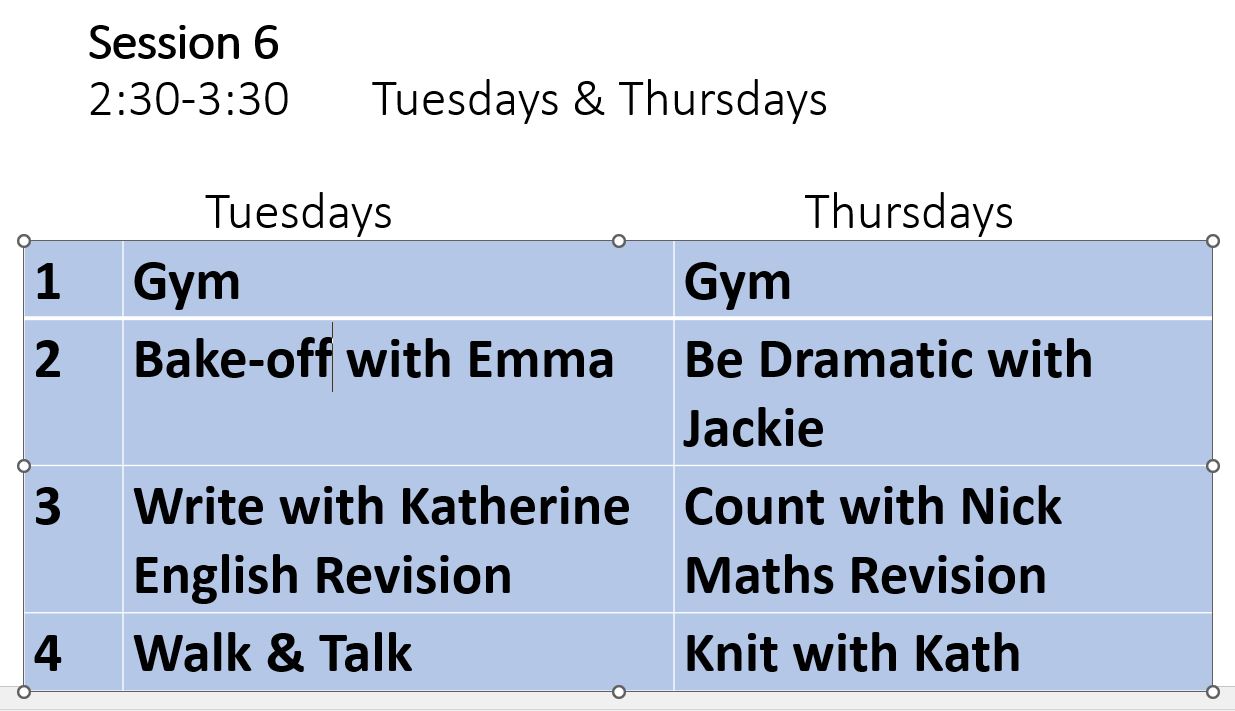 We are pleased to be offering from this week the opportunity for students to engage with our Session 6 programmes. Staff will be delivering supportive and creative sessions for students on Tuesdays and Thursdays this term from 2:30-3:30pm on a sign up basis. Transport home is the responsibility of the student, but we hope many will come along to try something new!
