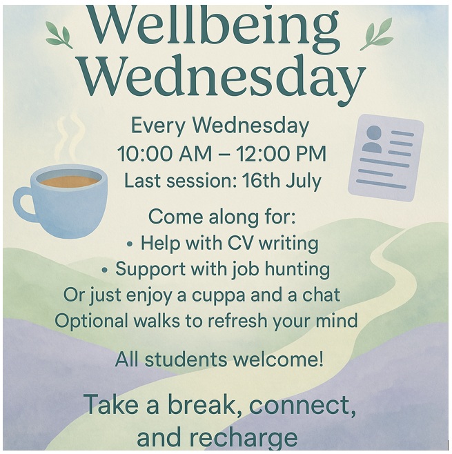 The Post 16 Centre would like to remind all students that if they need any help with updating their CVs, or a check-in with staff, or even fancy popping in for a cup of tea and and chat. We will be hosting Wellbeing Wednesday Drop Ins every Wednesday from 10am-12pm at the Post 16 Centre from now until July 23rd.