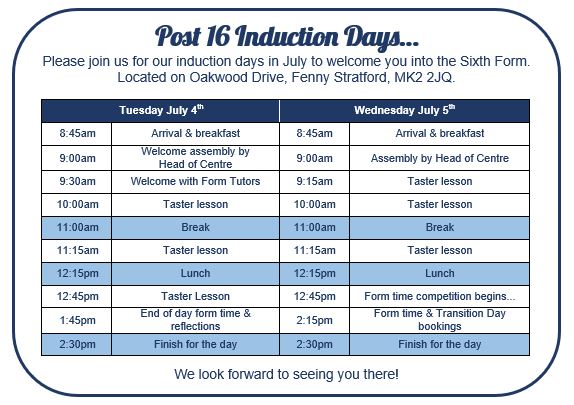 The Post 16 Centre is sending out induction days invitations this week to all new potential Year 12s and Year 13s to join us on Tuesday July 4th and Wednesday July 5th from 8:30am to 2:45pm for taster lessons and some pre-September socializing. These induction days are compulsory to gaining a place at Post 16 and after these there is a series of transition days with flexible sign up to offer a range of activities to get to know the staff and other students prior to our September start. For more information the induction days are outlined below. We look forward to welcoming in all new students next week